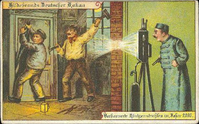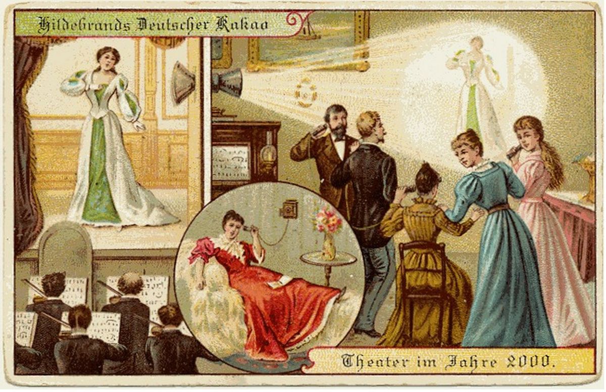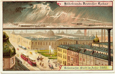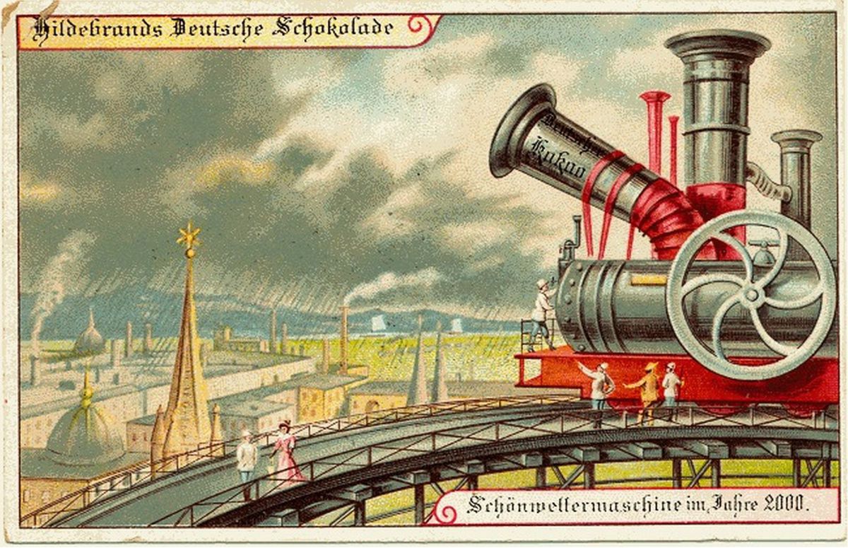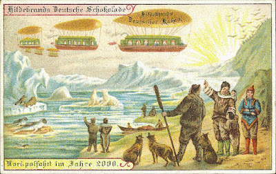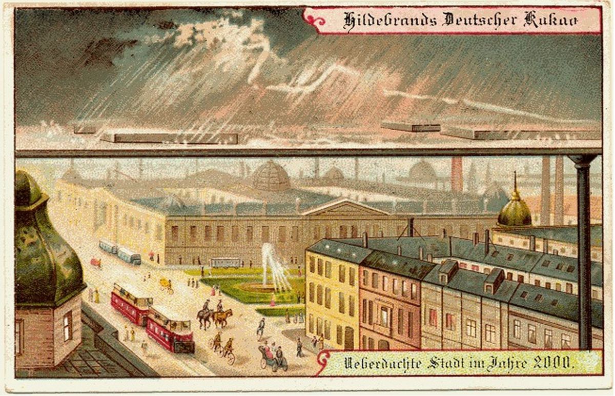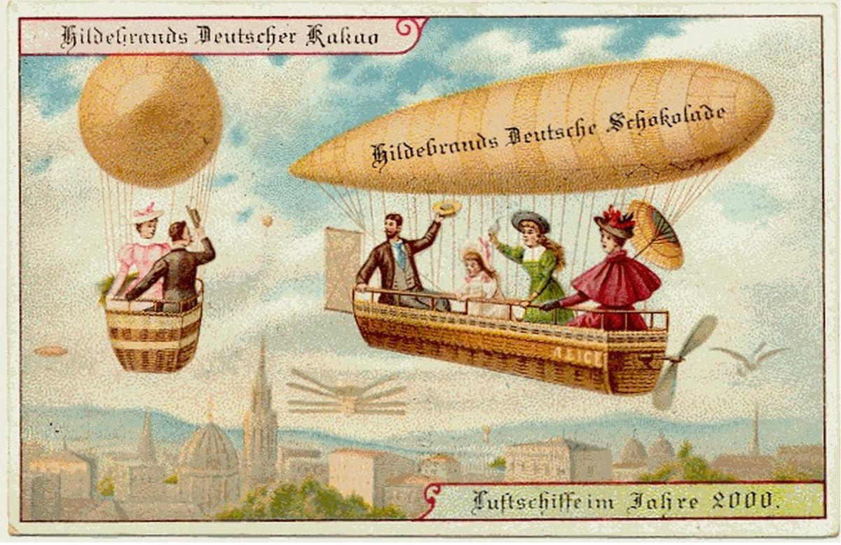 11/07/2020 — Em 1900, a empresa alemã de chocolate Hildebrands produziu uma série de cartões postais imaginando as maravilhas da vida no ano 2000.As representações otimistas imaginavam as pessoas da moda vitoriana desfrutando vidas de lazer e conforto sem limites, possibilitados por um século de avanço tecnológico.