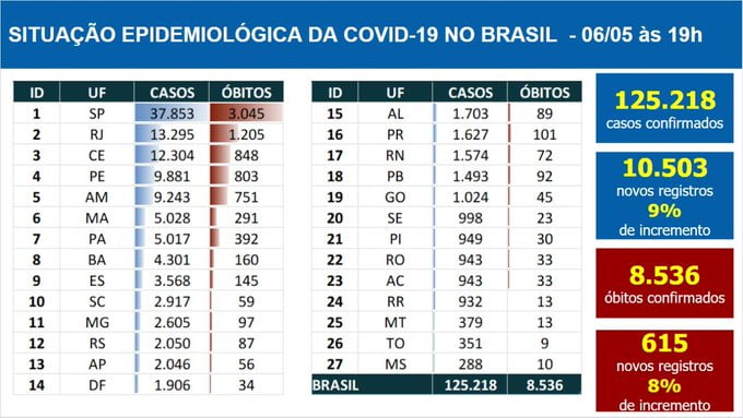 Na noite desta quarta-feira (06), o Ministério da Saúde divulgou atualizações sobre os casos confirmados, em acompanhamento, recuperados, óbitos totais, óbitos nos últimos 3 dias e óbitos em investigação.