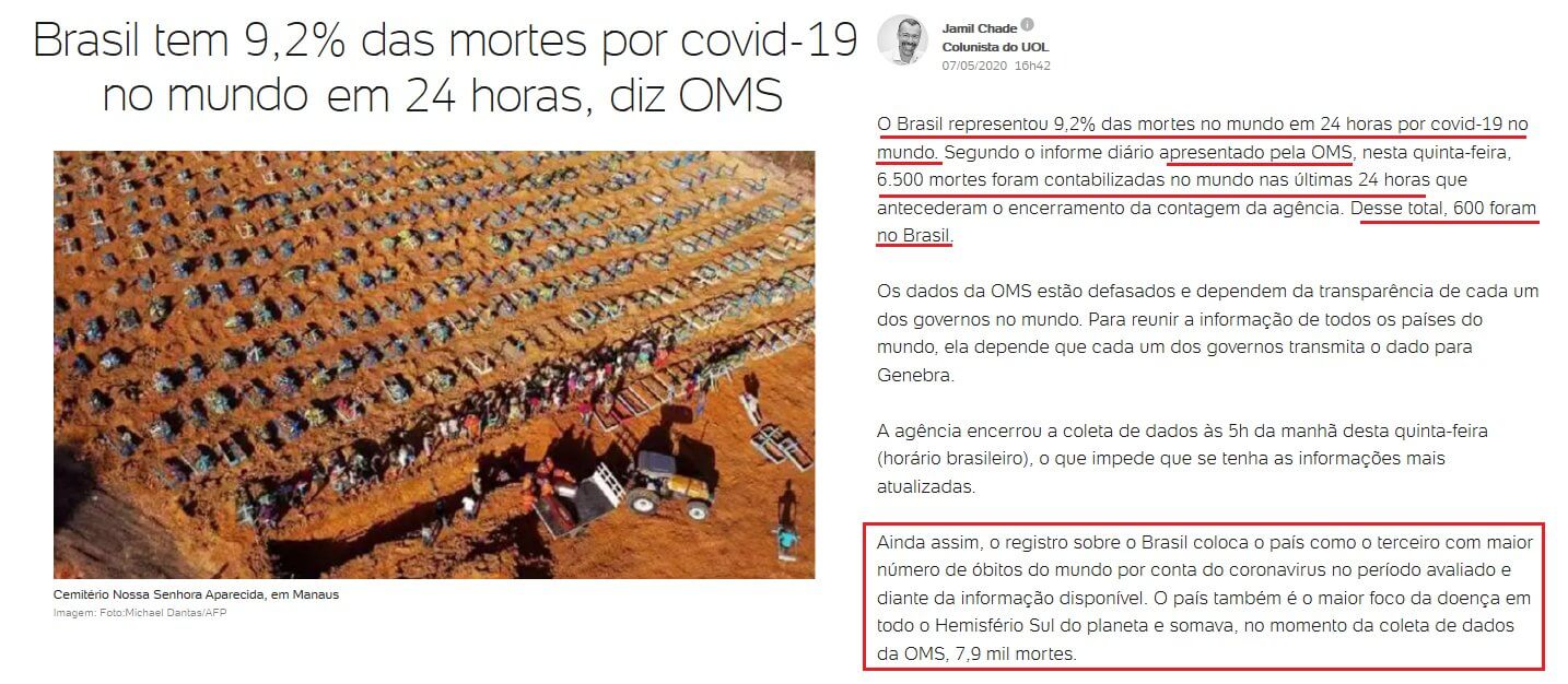Porém, a grande imprensa alarmista não se privou de divulgar não somente a leitura dos dados de forma errada, mas ranquear o Brasil como um dos piores países do mundo no combate à C0VID 19. Para piorar a situação a Organização Mundial da Saúde (OMS) endossou a narrativa.