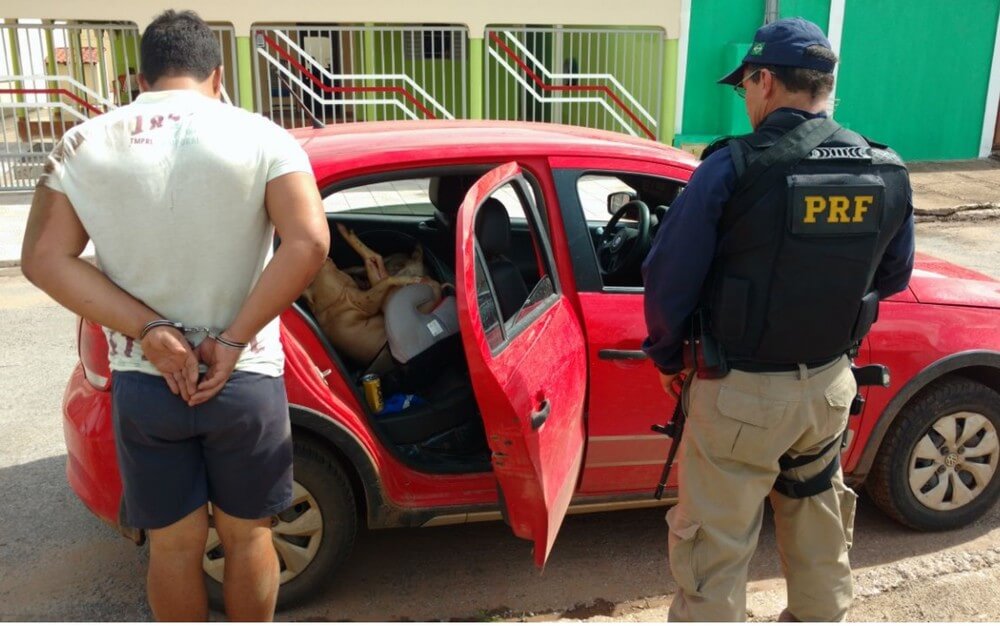 Um jovem de 26 anos foi preso por dirigir embriagado na BR-070, em Aragarças, na região sudoeste de Goiás. Dentro do veículo, além de várias latas de cerveja, a Polícia Rodoviária Federal também encontrou dois porcos mortos no banco de trás, sendo que um deles estava em uma cadeirinha usada para transportar crianças.