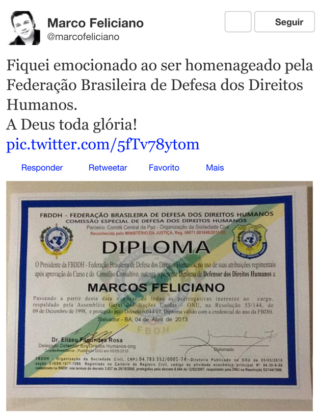 O deputado Marco Feliciano , no início de abril de 2013 respondeu às críticas de que é homofóbico e racista com um diploma: a titulação lhe foi dada pela autodenominada Federação Brasileira de Direitos Humanos. O pastou postou a foto no Twitter.