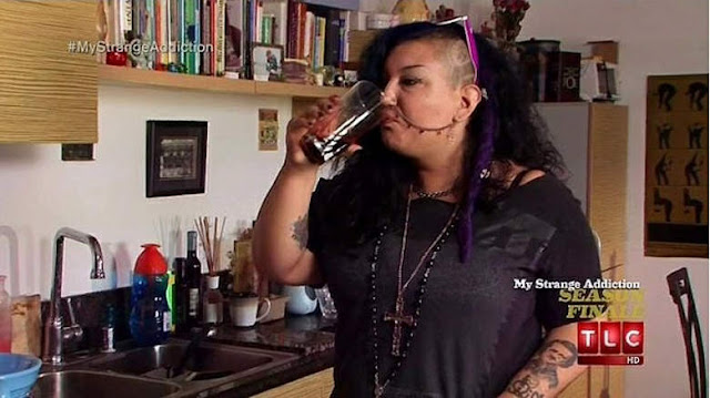 Michelle, 29, é uma tatuadora americana que tem um vício bem bizarro. Ela é viciada em beber sangue humano e sangue animal. A “vampira” chega a beber 36 litros de sangue de porco por semana, mas diz que prefere beber sangue humano.