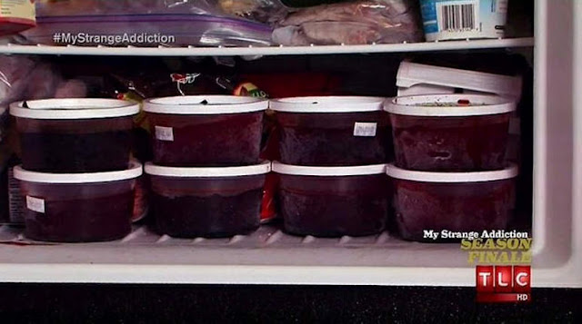 Ela estoca sangue de animal no congelador e já é seu costume beber sangue humano uma vez por semana. Michelle compara seu vício com o de um fumante.